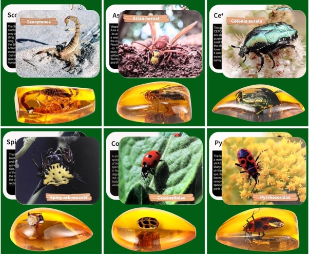 Očiščene najdbe lahko shranite v vrečko za fosile ali razstavite na prezentacijskem stojalu. Priložene so tudi informativne kartice v angleščini s slikami žuželk – odličen način, da igro povežete z osnovami naravoslovja in učenjem tujega jezika.