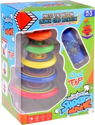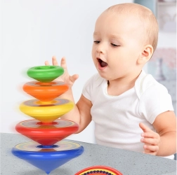 Ta barvit piramidni komplet vrtavk je zasnovan za otroke različnih starosti. S pomočjo praktičnega ročaja (launcherja) vrtavke zlahka spravite v vrtenje, kar zagotavlja gladko in privlačno gibanje na mizi ali tleh. Igrača spodbuja koordinacijo oko–roka, potrpežljivost in zbranost.