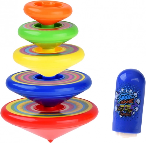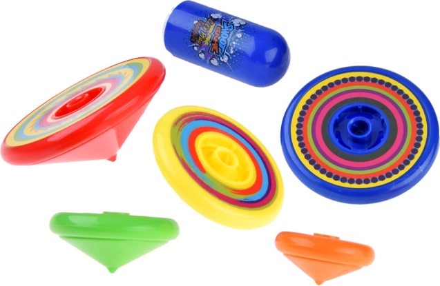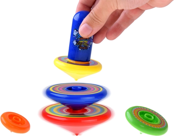 Pet vrtavk različnih velikosti vabi k tekmovanjem za najdaljši čas vrtenja in k ustvarjanju zabavne vrteče se piramide.