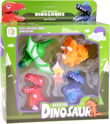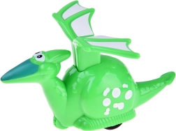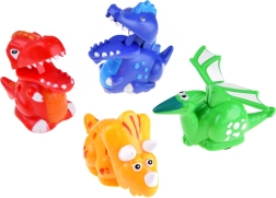 Odkrijte igriv set voznih dinozavrov, ki spodbuja domišljijo in fino motoriko otrok. Vsak dinozaver ima preprost mehanski pogon – dovolj je pritisniti ustrezen element (gobec, krila ali ovratnik) in figurica se zapelje naprej. Vesele barve in zaobljene oblike so idealne za male roke.