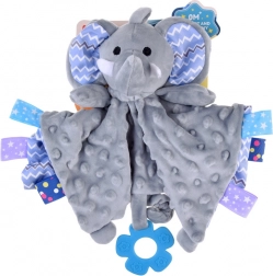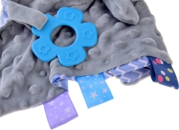 Ta mehka ninica združuje cartljivo odejico, zabavno igračo in praktično grizalo v enem. Raznolike teksture materiala in barvite etikete vabijo k dotikanju, stiskanju in raziskovanju, medtem ko nežni piskajoči in šumeči elementi spodbujajo slušno zaznavo.