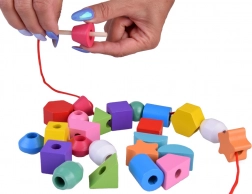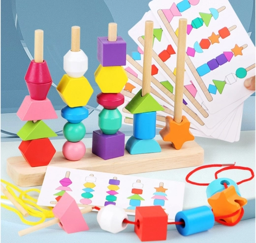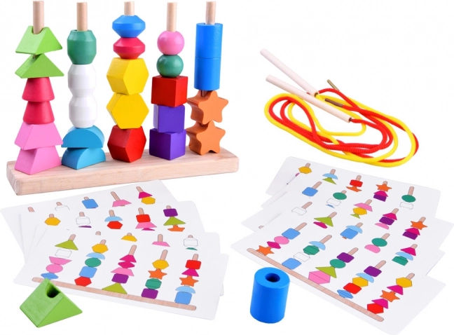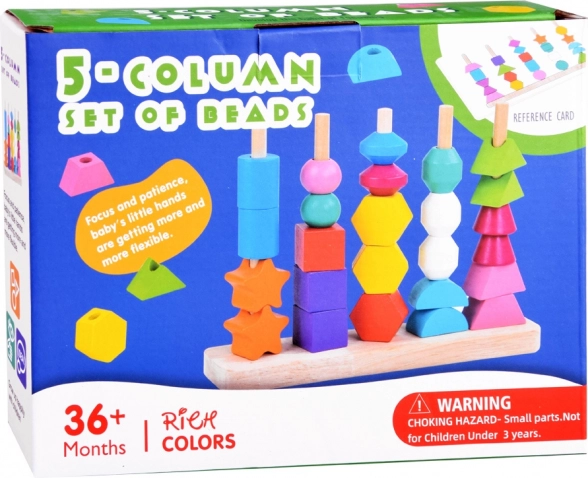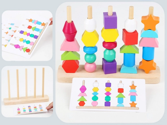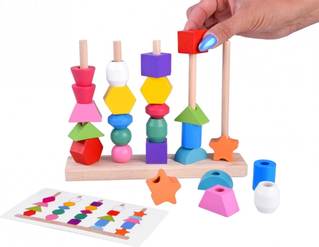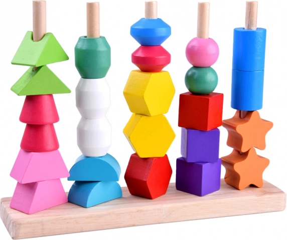 Ta vsestranska lesena igrača ponuja dva načina igre: nizanje barvitih kroglic na vrvice in zlaganje oblik na stojalo s petimi količki po predlogah. Zaradi živih barv in raznolikih geometrijskih oblik naravno podpira razvoj vida, tipa in prostorskega zaznavanja.