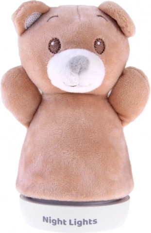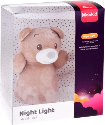 Enostavno in stabilno stojalo omogoča varno postavitev na nočno omarico ali polico. Svetloba samodejno menja barve (npr. modra, zelena, rdeča, rumena) in ustvarja prijetno atmosfero za malčke in dojenčke. Plišasto prevleko je možno preprosto snemiti in očistiti.