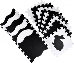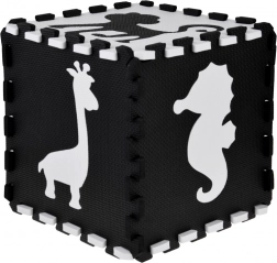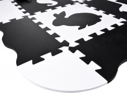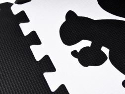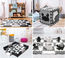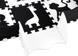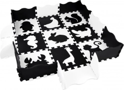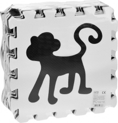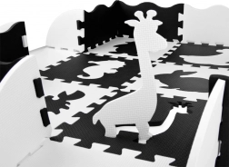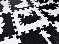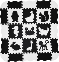 Ta kontrastna penasta podloga z motivi živali združuje moderen videz in praktičnost. 16 mehkih kosov velikosti 30 × 30 × 1 cm enostavno sestavite v dimenzijo 120 × 120 cm ali jih prilagodite prostoru. Nekatere plošče imajo odstranljive sredinske elemente, ki spodbujajo fino motoriko ter učenje oblik in živalic.