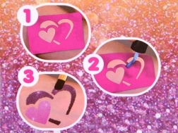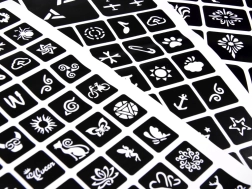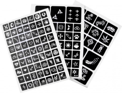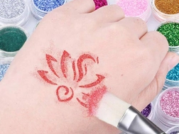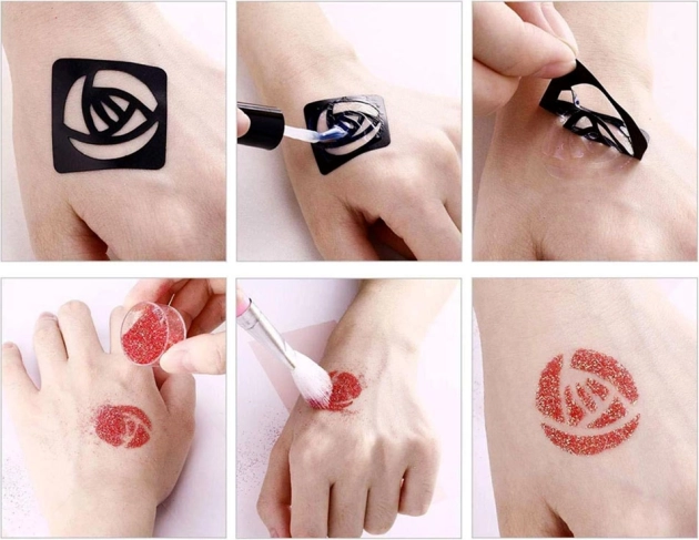 Navodila: Izberite šablono in jo prilepite na čisto kožo, nanesite vzorec z lepilom, odlepite šablono, dodajte barve bleščic in gotovi ste!