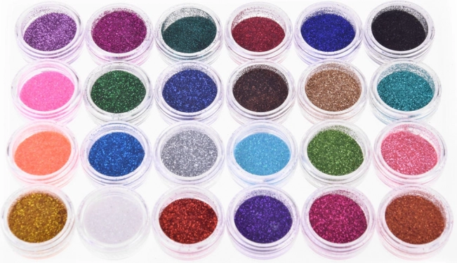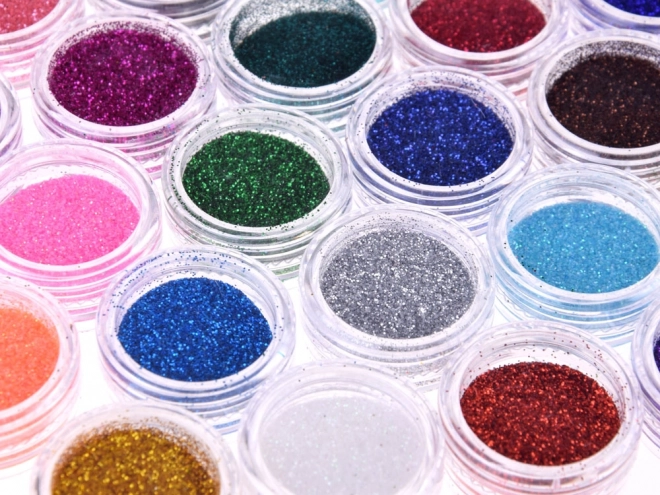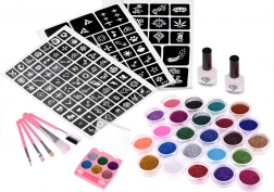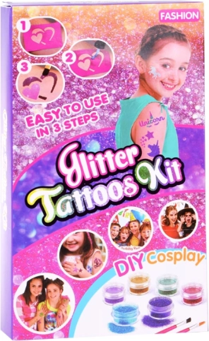 Komplet vsebuje vse potrebno za ustvarjanje osupljivih bleščečih tetovaž s 24 različnimi barvami bleščic.