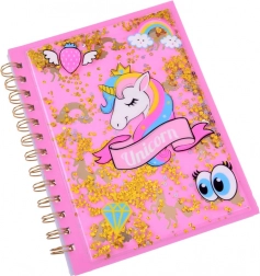 Zvezek z roza ozadjem in zlatim leskom izstopa s svojim čarobnim dizajnom, ki vabi k pisanju in risanju.