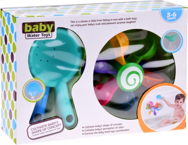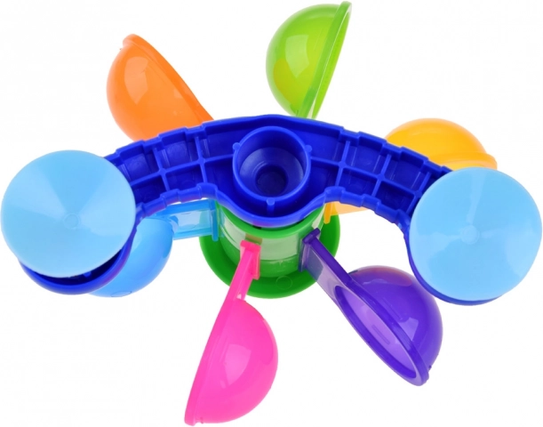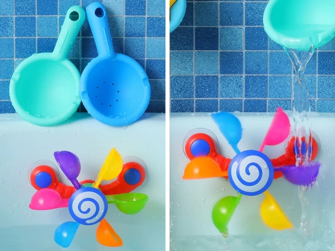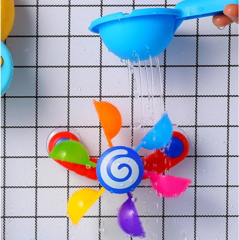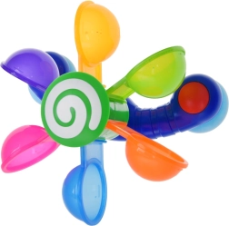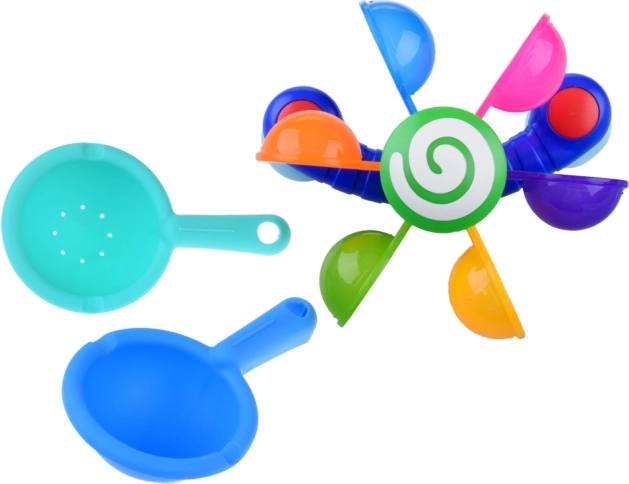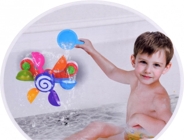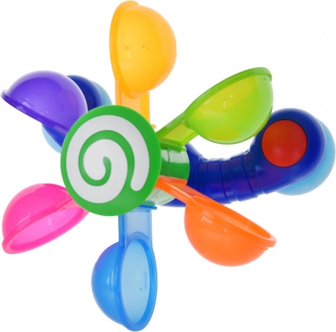 Omogočite svojemu otroku uživanje v zabavi s barvnimi gibljivimi posodicami, ki se vrtijo, ko se nanje lije voda, kar otroku omogoča učenje konceptov gibanja in povratne reakcije. Ta igrača podpira motorni razvoj, kognitivne funkcije in koordinacijske sposobnosti. Med igro se otrok lahko uči o barvah, štetju in si predstavlja različne zgodbe. Ta kopalna igrača je lahko prenosljiva in razstavljiva, kar omogoča njeno postavitev na robove kadi, tuša ali bazena. Barvni spekter posodic se začne vrteti medtem ko voda šumi in spodbuja otrokov sluh.