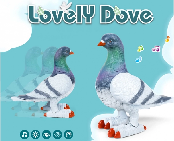 Interaktivni golob se lahko počasi premika naprej, maha s krili in utripa z očmi, kar dopolnjuje vesela melodija.