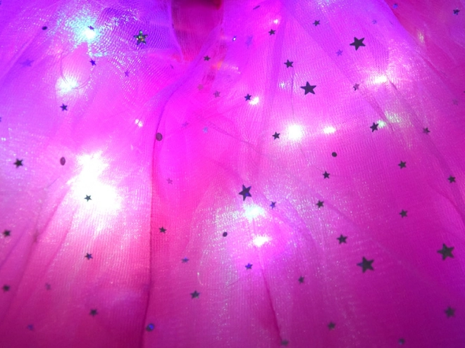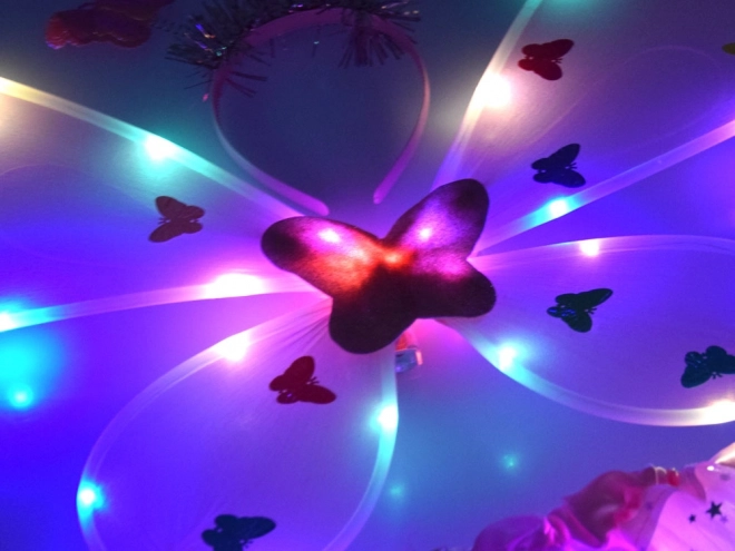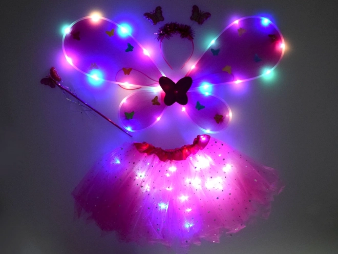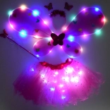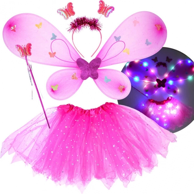 Očarljiv otroški preoblečni set vsebuje rožnato tutu krilo, metuljeva krila, naglavni trak in čarobno paličico. Zahvaljujoč vgrajenim LED lučkam v krilu in krilih ustvarja čaroben učinek, ki poživi vsak karneval, zabavo ali igro doma. Udobno elastično prileganje in lahkoten til z bleščečimi zvezdicami zagotavljata udobje in neomejeno domišljijo.