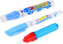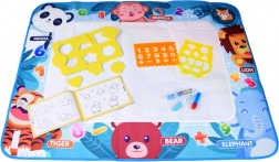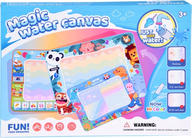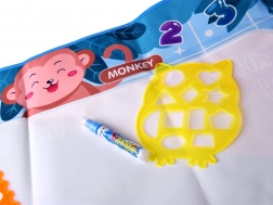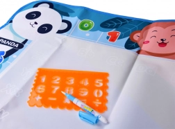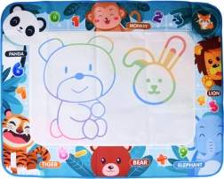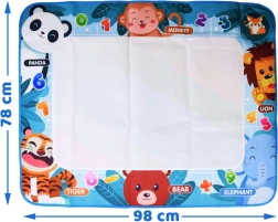 Ta barvita podloga z merami 98 x 78 cm ima pisano ozadje, ki vsak izdelek spremeni v naslikano mojstrovino. Robovi podloge so okrašeni s slikami živali z napisi v angleščini, kar otrokom omogoča učenje angleščine skozi igro. Igra je povsem varna – dovolj je, da flomaster napolnite z vodo in začnete risati, slikati ali pisati.