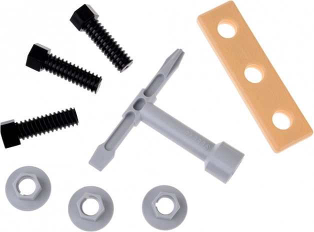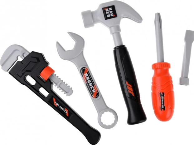 Za vsak malega mojstra, ki si želi preizkusiti svoje popravljalske sposobnosti, je ta velik set orodij odlična izbira. Set sestavljajo plastična orodja v treh barvnih kombinacijah: črna, oranžna in siva, ter ponujajo realistične oblike, ki spodbujajo k ustvarjalni in domiselni igri. Vsakdanja popravila postanejo zabava, naj bo to pritrjevanje kolesa na avtomobilčku ali zategovanje vijaka na hišici za punčke.