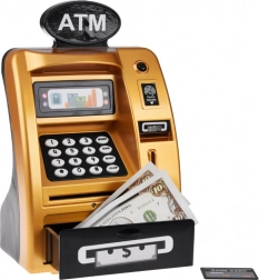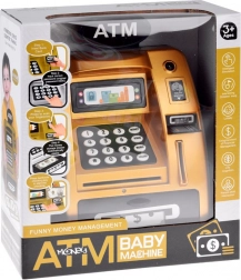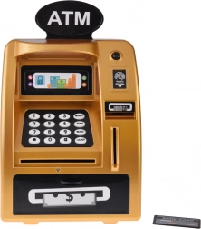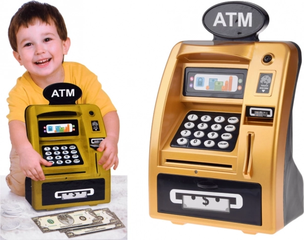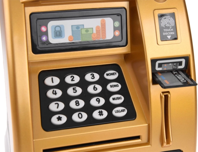 Spoznajte zlati bankomat, ki izgleda in deluje kot pravi bankomat. Izdelan je iz plastike z realističnim dizajnom, ki vključuje tipkovnico, digitalni zaslon in režo za kartico. Z vstavljanjem igralne kartice in vnosom PIN kode otroci aktivirajo funkcije bankomata.