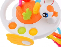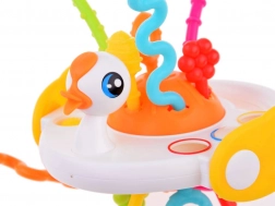 Ta barvita senzorična igrača v obliki laboda podpira naravni razvoj čutov in spretnosti vašega dojenčka. S kombinacijo različnih površin, mehkih gumbov ter vlečnih vrvic z zvokom in vibracijami otroci odkrivajo nove dražljaje, urijo prijem in krepijo koordinacijo oko–roka.