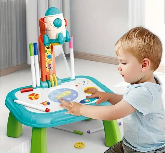 Prebudite otroško domišljijo s projekcijsko mizico Kozmos. Zahvaljujoč projektorju v obliki rakete se na površino ali na steno projicirajo slike, ki jih otroci zlahka prerišejo in se naučijo pravilnih potez. Igrača razvija kreativnost, fino motoriko in zbranost, idealno za otroke od 3 let.
