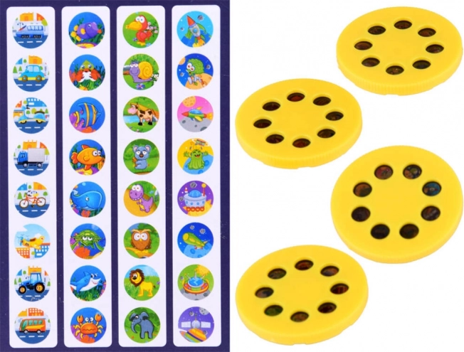 V kompletu je 8 barvnih flomastrov, 4 motivni diski (vesolje, živalice, vozila, podvodni svet), zaloga papirjev in stabilna risalna tabla – ne potrebujete ničesar več.