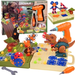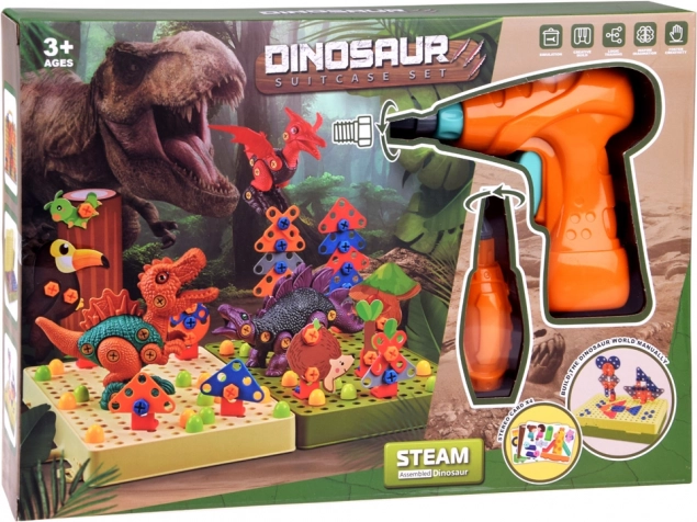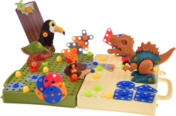 Ta zabavna sestavljanka otrokom omogoča, da s pomočjo vijakov, matic in orodja sestavljajo barvite oblike in dele dinozavrov. Otroški vrtalnik na 2× AA (baterije niso priložene) in izvijač spodbujata spretnost, koordinacijo oko–roka ter učita osnov tehničnega razmišljanja v duhu STEAM.