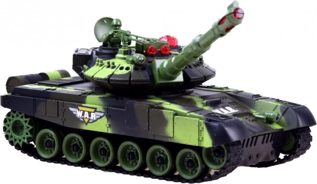 Uživajte v akcijskih dvobojih z RC tankom v gozdni kamuflaži. Model obvlada vožnjo naprej/nazaj, vrtenje na mestu in ima vrtljivo kupolo za 180° na vsako stran (skupno 360° pokritja). Ob zadetku se prižigajo/ugašajo kontrolne lučke stanja bitke, tank pa simulira realističen odsun (povratni sunek), ki še poudari vzdušje pravega bojišča.