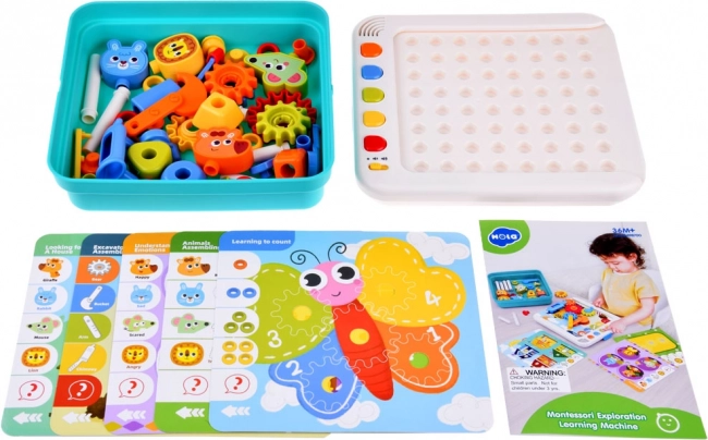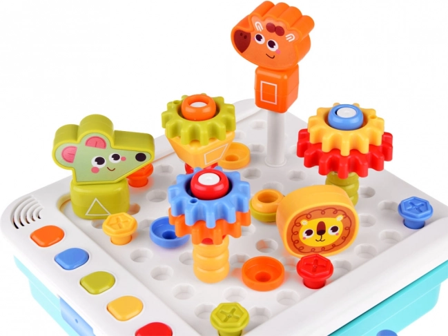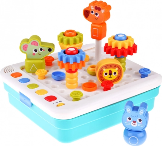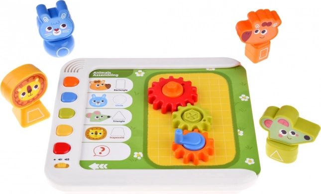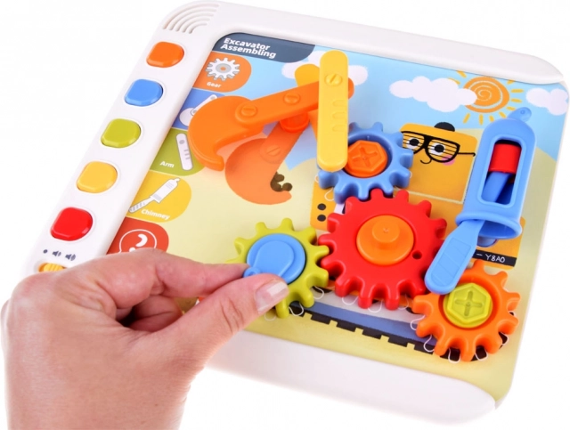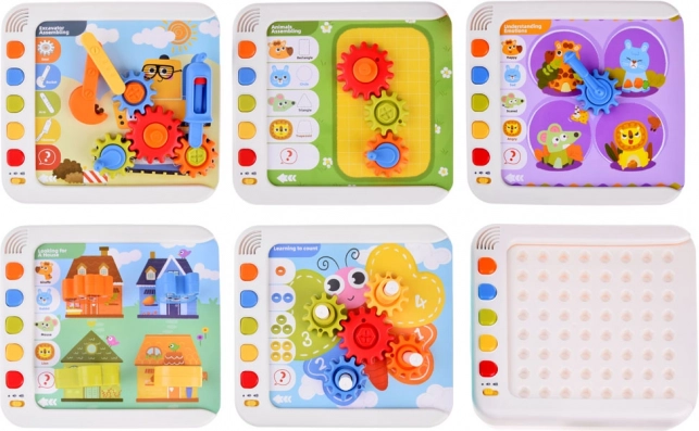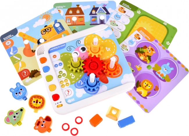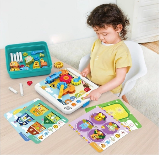 Vsebina vključuje elektronsko tablo, predalček za delčke, 5 tematskih kartic, barvne kocke in zobnike, figurice živali (žirafa, zajec, miška, lev) ter barvno ilustrirano knjižico. Otrok lahko gradi gibljive konstrukcije, razvija koordinacijo oko–roka in razumevanje mehanike prenosov. Rdeči gumb na tabli sproži dodatne izzive za še več zabave.
