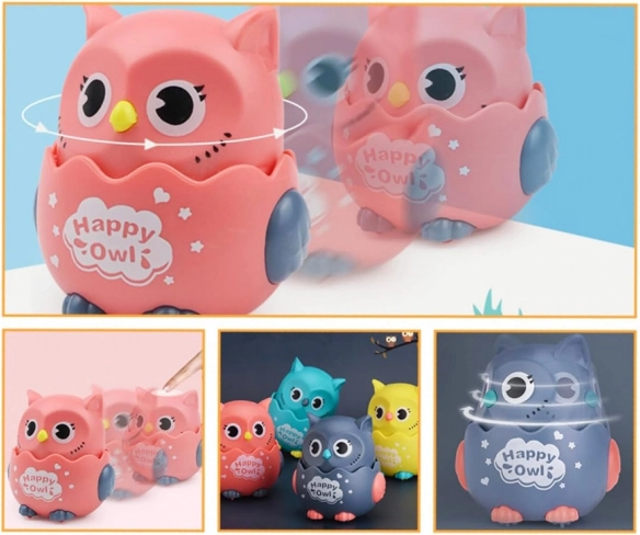 Barvita plastična sovica na kolescih prinaša zabavo za najmlajše. Dovolj je, da jo postavite na ravno površino, pritisnete glavico in sovica se zapelje naprej. Zaradi kompaktne velikosti za otroško ročico je idealna za prve igre, spodbuja gibanje, plazenje in koordinacijo. Z obračanjem glavice se oglaša prijetno ropotanje, ki pritegne otrokove čute in lahko služi tudi kot antistresna igrača.