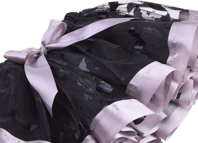 Črno mrežasto krilo z dekorativnimi vzorci, vijoličnim robom in pentljo. Elastičen pas zagotavlja udobje in enostavno oblačenje.