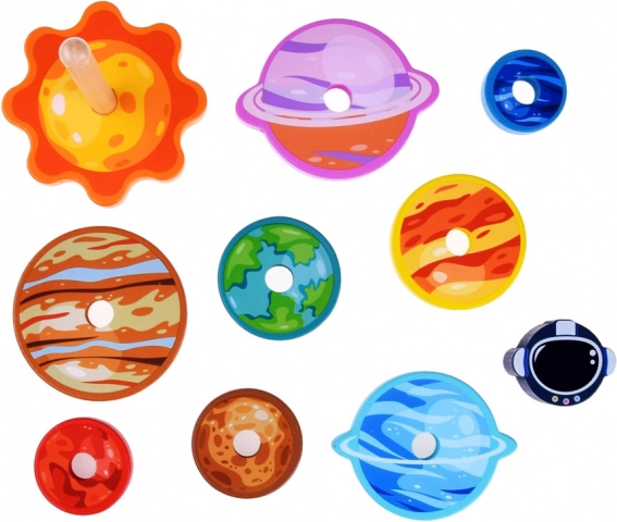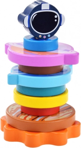 Lesena sestavljanka s prostorom kot motivom je idealna igrača za otroke, ki radi odkrivajo nove stvari in izboljšujejo svoje ročne spretnosti. S pomočjo te sestavljanke se otroci naučijo razvrščati diske po velikosti od največjega do najmanjšega, pri čemer piramido krona del v obliki astronavtske čelade.