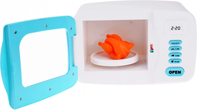 V notranjosti mikrovalovne pečice je plastični model piščanca, ki se med vklopom vrti na krožniku. Notranjost pečice je med simuliranim delovanjem osvetljena z rdečo svetlobo, kar povečuje avtentičnost izkušnje. Ta izdelek podpira otroško domišljijo in vzbuja zanimanje za kuhanje ter pripravo jedi.