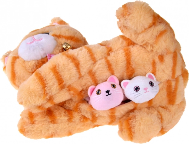 Plišasta mamica z dvema muckoma, skritima v trebuščku, spodbuja skrbno igro in fino motoriko. Velike oči in pentlja z zvončkom bodo navdušile otroke.