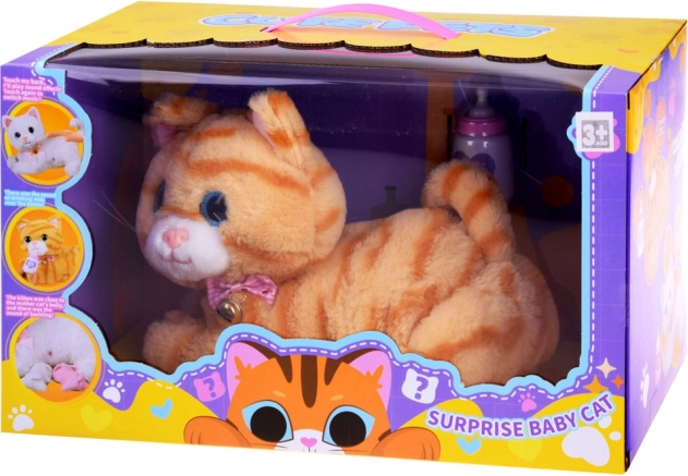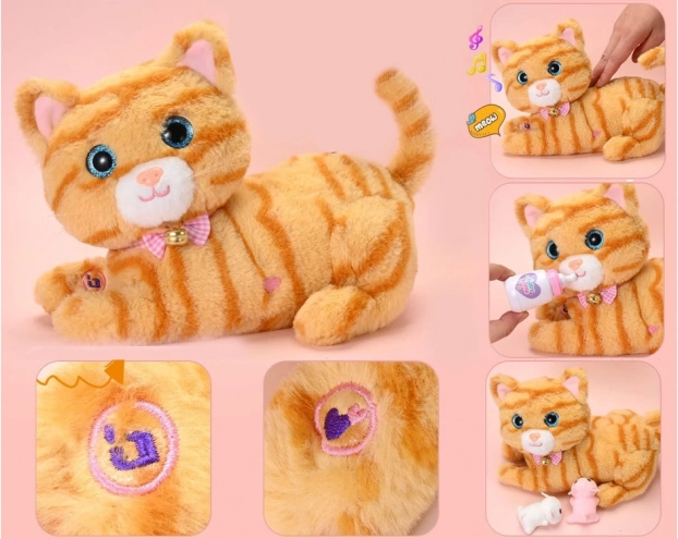 Prislonite stekleničko k gobčku in mačka bo oddala zvok pitja. Ko približate mucke k srčku na trebuščku, se oglasijo realistični zvoki sesanja.