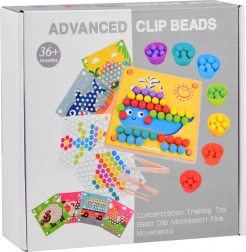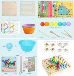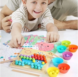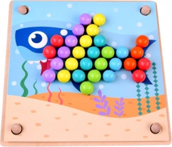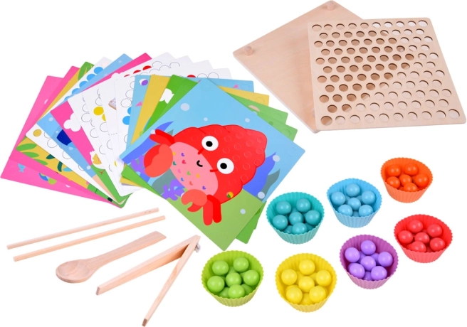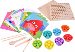 Ta leseni mozaik ponuja 77 barvnih kroglic v 7 barvah, dvodelno leseno ploščo in bogat komplet dodatkov, vključno s silikonskimi posodicami, pinceto, palčkami in žličko. Otroci lahko sestavljajo motive iz 10 tematskih predlog (npr. rak, hobotnica, morski pes, skat, kit, petelin, ovčka, kravička, dinozaver, avtobus) in 5 predlog za ustvarjanje vzorcev – ali pa ustvarjajo po svoji domišljiji.