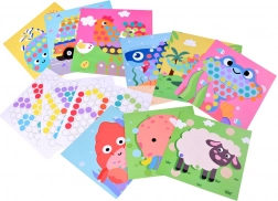 Vključuje 10 slikovnih predlog in 5 vzorčnih kartic. Otroci lahko sestavljajo živalice in prevozna sredstva ali ustvarjajo lastne mozaike.