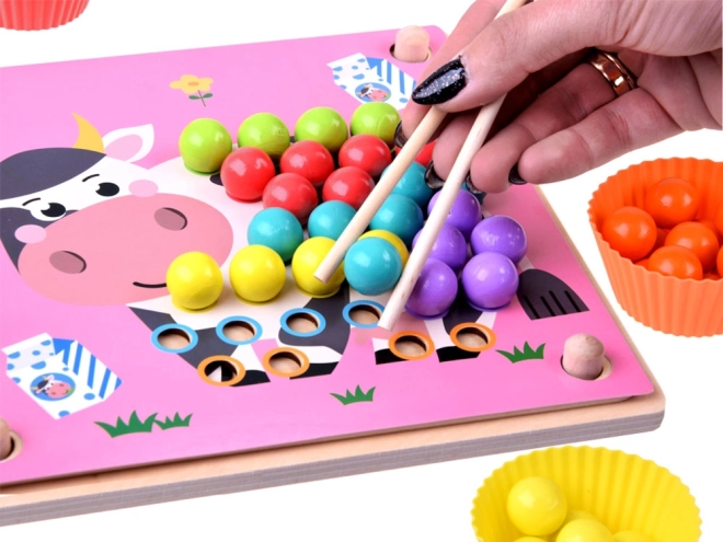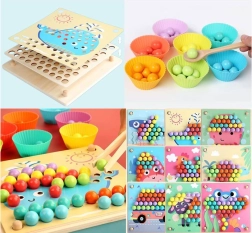 Otroci upravljajo kroglice s pomočjo palčk, pincete in žličke ter tako krepijo koordinacijo oko–roka in spretnost prstov – idealna priprava na pisanje.
