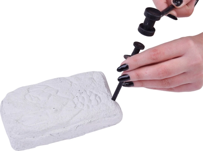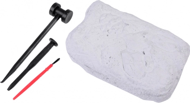 Del paketa so mavčna “skala”, kladivce, dletce in čopič za skrbno odstranjevanje prahu in drobcev. Dovolj je, da podložite delovno površino, rahlo navlažite površje in začnete odkrivati. Odlična ideja za darilo za male geologe in paleontologe.