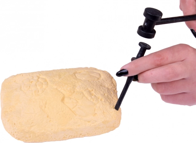 Trden, a enostavno obdelovalen mavčni blok otrokom omogoča varno in postopno razkrivanje skritih kamnov kar na mizi.
