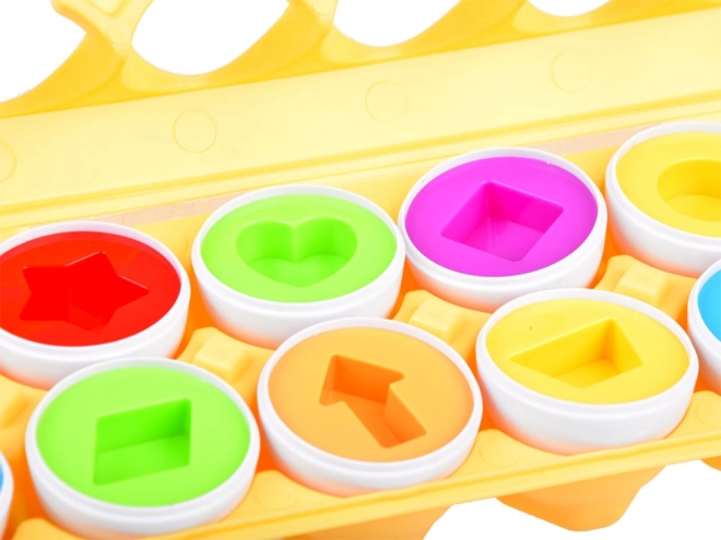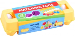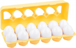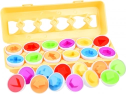 Ta pameten komplet vsebuje 12 belih jajčk, spravljenih v rumenem plastičnem pladnju. V notranjosti otroci najdejo raznobarvne polovice z oblikami, ki jih je treba pravilno spariti po barvi in obliki (npr. zvezda, srce, krog, kvadrat in druge). Igra podpira zgodnji razvoj veščin, uči potrpežljivosti in zbranosti.