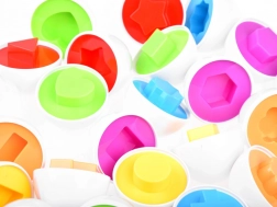 Vsako jajčko ima v notranjosti določeno obliko in barvo. Otroci povezujejo pravilne polovice in si naravno prisvajajo osnovne pojme ter logično mišljenje.