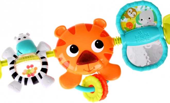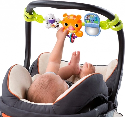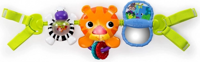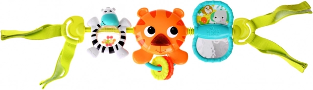 Preko tekstilnih trakov igračo enostavno pritrdite na voziček, avtosedež ali posteljico, kar omogoča zabavo doma in na poti.