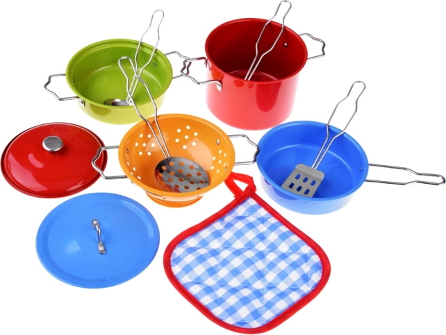 Barvit kovinski set za male kuharje prinaša realistično igro kuhanja. Vsebuje lonce, ponev, cedilo in pripomočke ter je idealen za razvoj domišljije, drobne motorike in igre vlog v otroški kuhinji.
