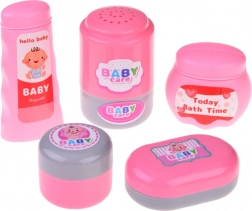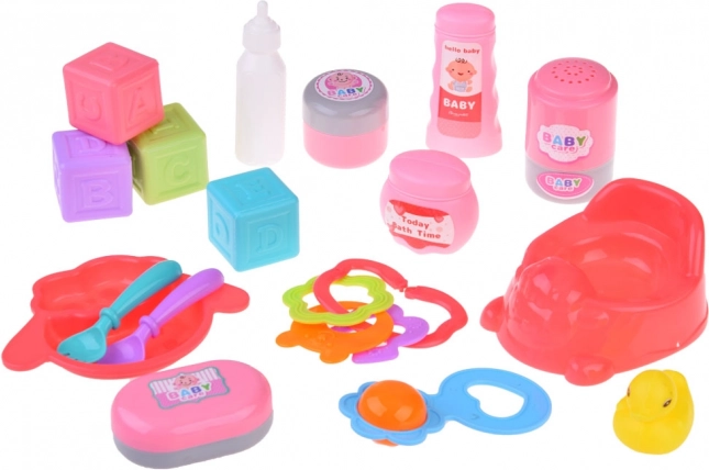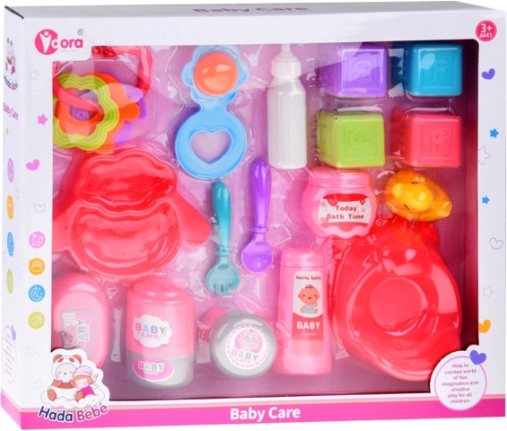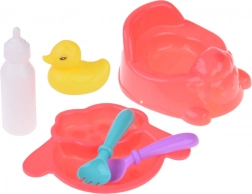 Ta komplet otroških igrač ponuja vse, kar majhna mamica potrebuje za nego svojih punčk. Vsebuje osnovna orodja za igranje vlog, kot so kahlica, krožniček z žličko in vilico ter različne stekleničke in račko za kopanje. Vsaka od teh rekvizitov je oblikovana za podporo domišljiji in motoričnim spretnostim otrok.