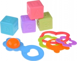 Komplet vsebuje elemente, ki pomagajo pri razvoju fine motorike in koordinaciji oči in roke, kot so barvne račke in različne igrače za sestavljanje.