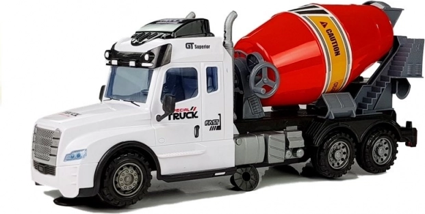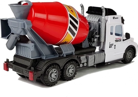 Belo‑rdeč mešalnik z realističnimi detajli, premično »hruško« in gladkim tekom koles pričara pravo gradbiščno vzdušje pri igri.