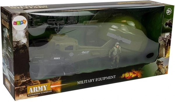 Ta vojaški komplet v umirjenih kamuflažnih barvah bo navdušil vse male ljubitelje akcijskih misij. Helikopter z 360° vrtljivimi rotorji in frikcijskim pogonom se po navijanju sam zapelje, figurica vojaka ima premične roke, čelada pa otrokom pričara občutek prave pustolovščine. Vsak element je izdelan z občutkom za podrobnosti za maksimalno realistično igro.