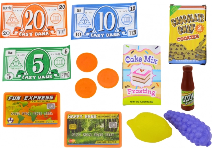 Set vključuje igralni denar, bankovce, kovance in plačilne kartice, kar je odlična priložnost za učenje štetja denarja in razvoj medosebnih veščin skozi simulacijo trgovskih interakcij.