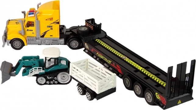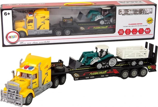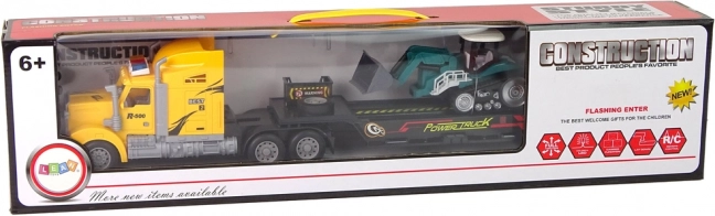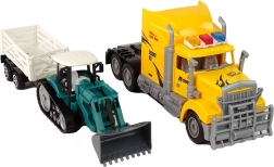 Vlačilec s prikolico omogoča malim graditeljem prevažati stroje in material kot v resničnem svetu. Tovornjak se upravlja z daljinskim krmilnikom, zato je mogoče udobno manevrirati naprej, nazaj in zavijati, medtem ko LED luči na strehi dodajo vožnji atraktiven učinek. Gosenični bager z odstranljivim priklopnikom odlično dopolni gradbene scenarije in razširi možnosti igre.