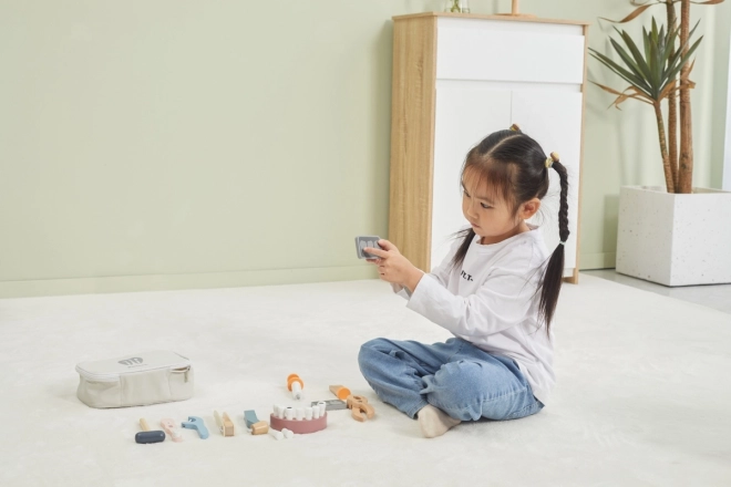 Vse je shranjeno v trpežni prenosni torbi, zato se komplet zlahka prenaša in pospravlja. Kakovosten lakiran les in netoksične barve zagotavljajo varno in dolgotrajno zabavo. Idealen dar za male zobozdravnike in zobozdravnice.