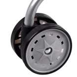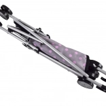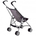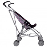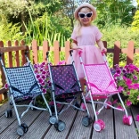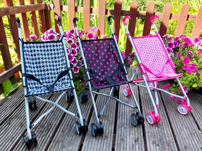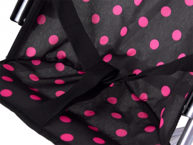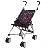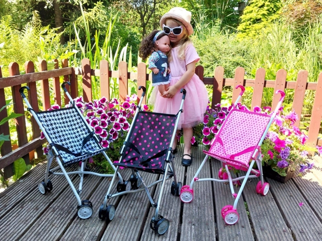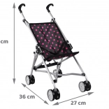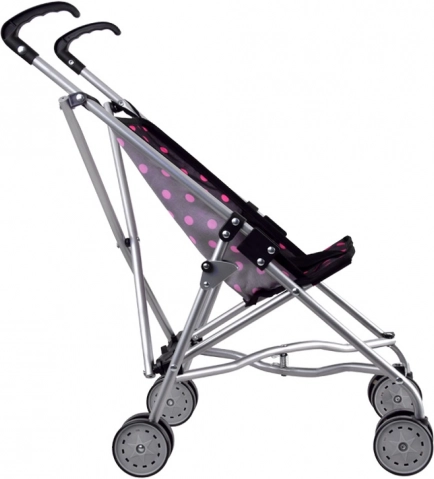 Tekstilni sedež v modernem črnem dizajnu z rožnatimi pikami je trpežen in prijeten na dotik. Dvojna kolesa zagotavljajo gladko vožnjo in dobro vodljivost na različnih podlagah. Varni zložljivi/razložljivi elementi ter pasovi v sedežu pomagajo, da punčka ostane na mestu.