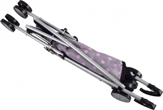 Lahek in kompaktno zložljiv voziček za punčke v črni barvi z rožnatimi pikami bo razveselil vsakega otroka. Zahvaljujoč čvrsti kovinski konstrukciji, udobnim ročajem in dvojnim kolesom za gladko vožnjo je odlično vodljiv in varen za vsakodnevno igro.