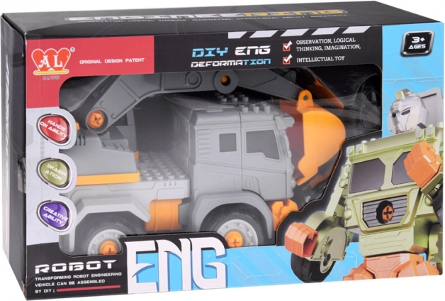Ta pameten model združuje gradbeno vozilo in akcijsko figurico v enem. Otroci lahko s priloženim izvijačem razstavljajo in ponovno sestavljajo dele, urijo fino motoriko in logično razmišljanje. Kabina, roka bagra in žlica so premične, robot po sestavi samostojno stoji in ima gibljive roke ter noge.