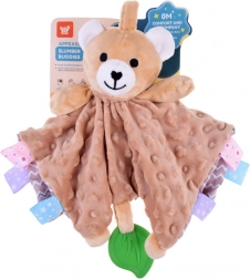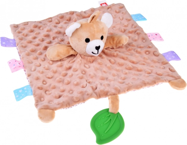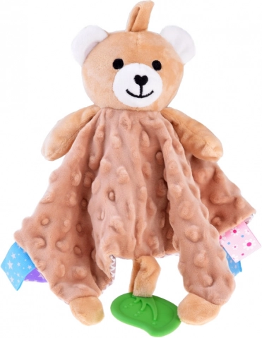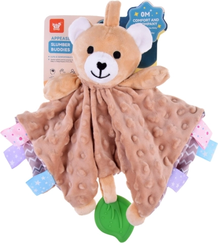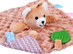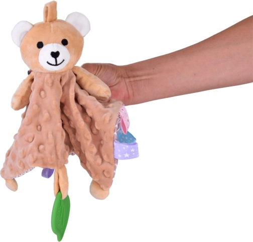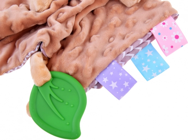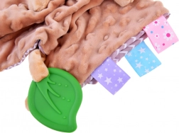 Ta mehka ninica združuje udobje crkljalne odejice in senzorične igrače. Otroka pritegnejo raznolike teksture, šušteči in piskajoči elementi ter barvite etiketke po robovih, ki vabijo k dotikanju, mečkanju in vlečenju. Zeleni silikonski list služi kot grizalo in pomaga masirati občutljive dlesni pri izraščanju zobkov.