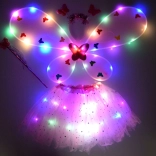 Očarajte na pustovanju ali rojstnem dnevu s svetlečim kostumom male vile v živo rožnati barvi. Set vključuje tutu krilo, metuljeva krila, paličico in naglavni trak. Vgrajene LED diode v krilu in krilih ustvarijo čarobne svetlobne učinke, medtem ko bleščeči detajli in lahki materiali zagotavljajo udobje in pravljičen videz skozi ves dan.